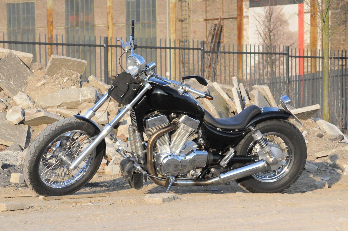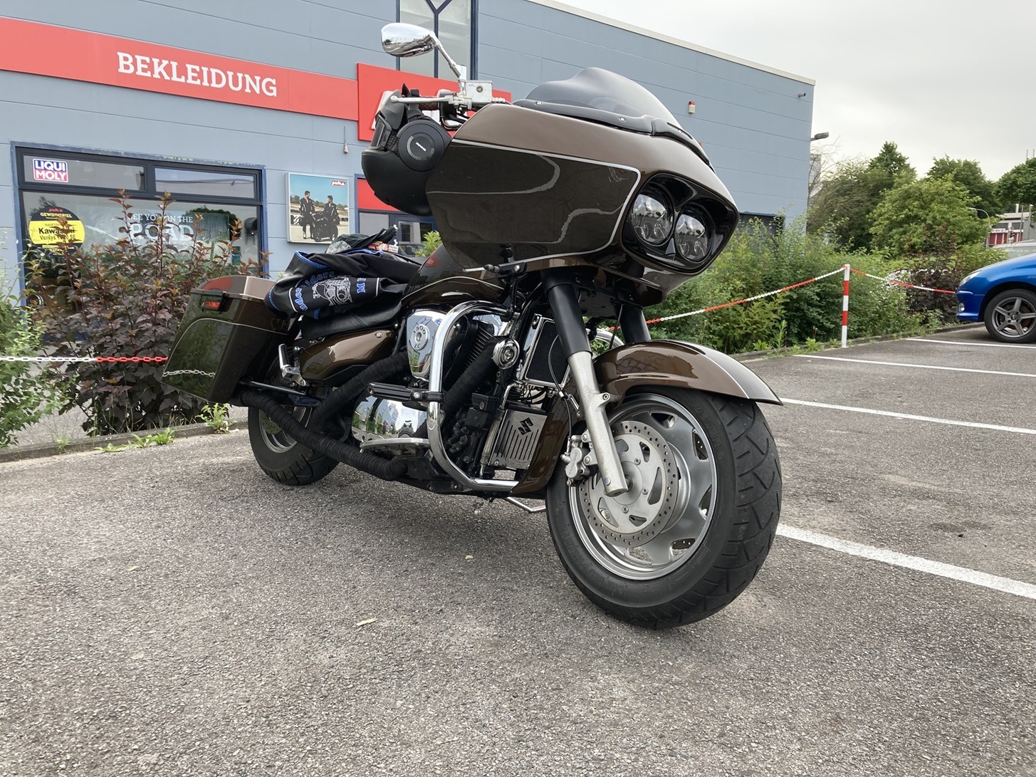 1987 wurde ein Jahr nach der kleinen 750er die 1400er Intruder vorgestellt und sie vertrat das selbe Chopper-Konzept. Der Rahmen war sehr stabil und erledigte seine Aufgabe tadellos, zumindestens so lange es geradeaus ging.